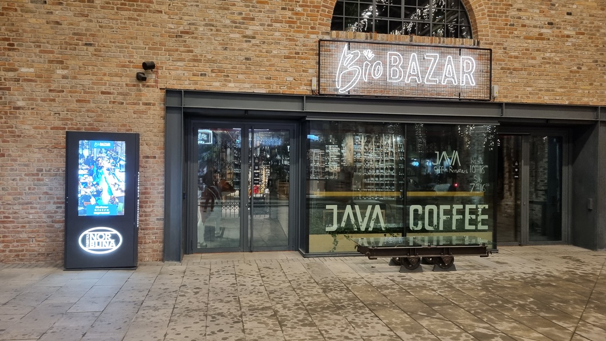 • Interaktywne totemy 55″ – trzy konstrukcje (dwa totemy jednostronne i jeden dwustronny) zamontowaliśmy w newralgicznych punktach w pasażach. Wyposażone w ekrany o wysokiej jasności, pełnią funkcję informacyjno-reklamową. Charakterystycznym elementem jest podświetlane logo, które czyni je integralnym elementem identyfikacji wizualnej miejsca.