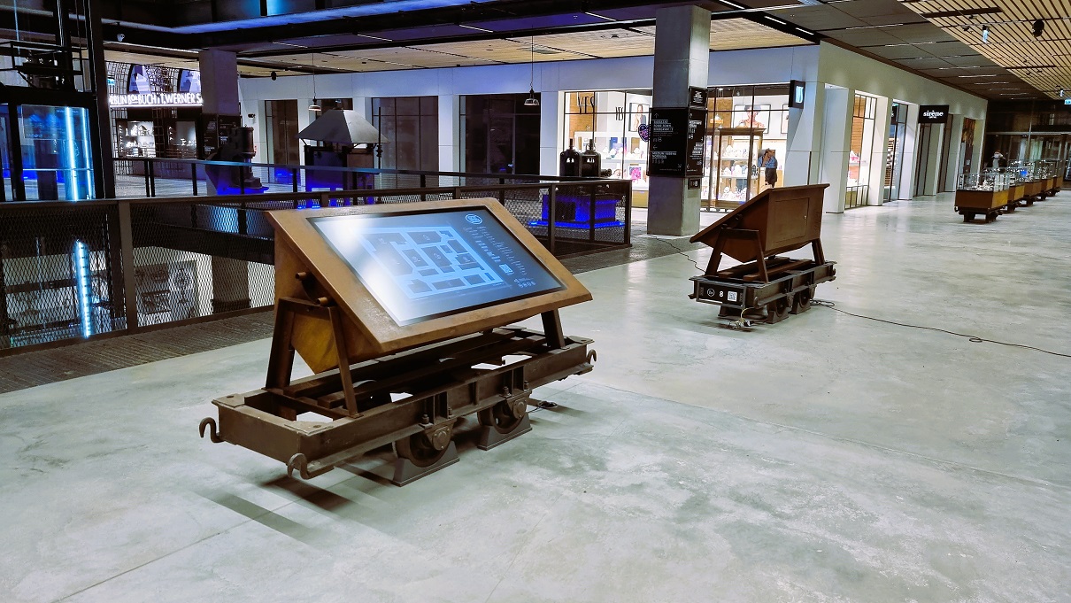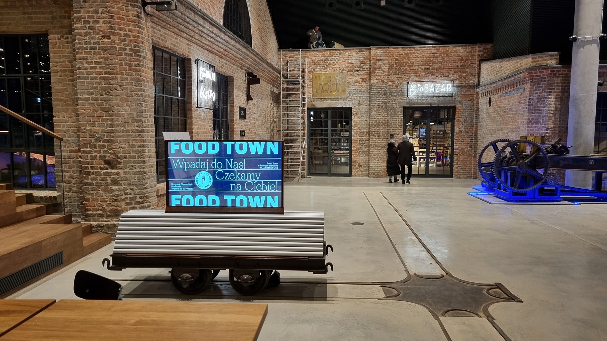 Do realizacji wewnętrznych, które zasługują na wyjątkową uwagę, należy Kiosk w wózku na prefabrykaty – przykład unikalnego podejścia do integracji. Transparentny ekran dotykowy o wysokiej rozdzielczości i kontraście został zamontowany w autentycznej przemysłowej konstrukcji, uzupełnionej o podest z rur, w którym ukryta jest elektronika sterująca w taki sposób, aby całość harmonijnie wpisywała się w otoczenie.