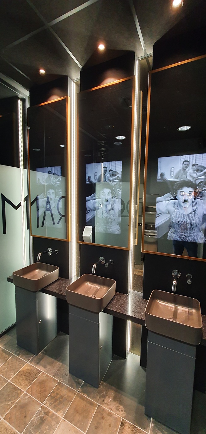 Jednym z najbardziej innowacyjnych rozwiązań w budynku są lustra weneckie z wbudowanymi ekranami 32″. Zainstalowaliśmy ich aż siedem – w różnych konfiguracjach w łazienkach Fabryki Norblina.