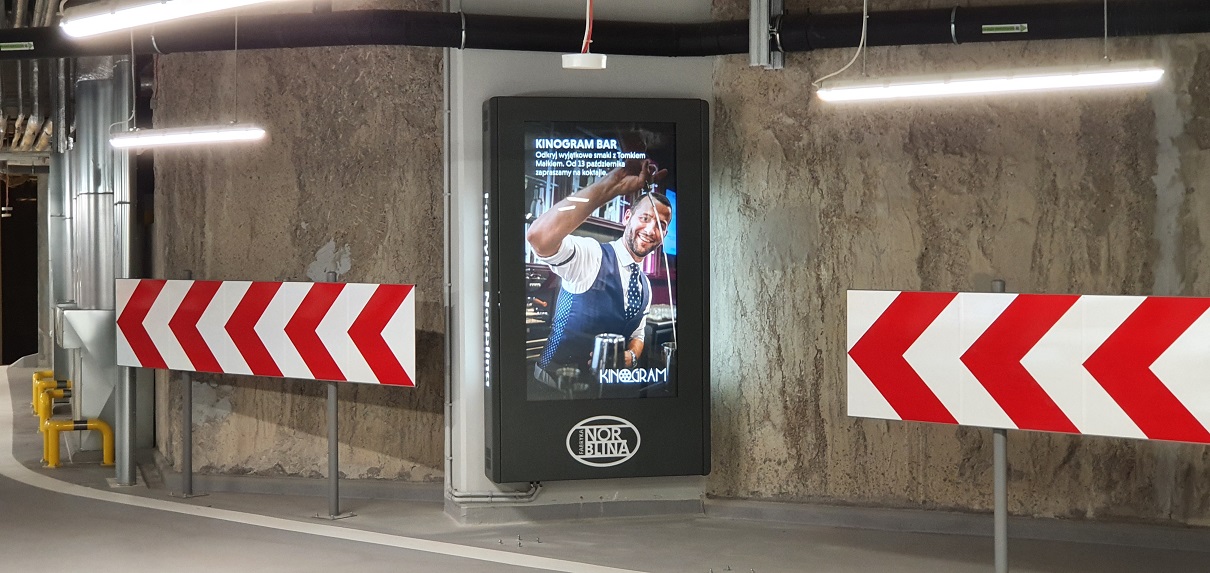 • Gabloty 75″ – naścienne przy wjeździe na parking podziemny, także w wersji high brightness, grające rolę zarówno reklamową, jak i informacyjną. Właśnie ta realizacja dała impuls do rozwoju całej naszej linii produktów zewnętrznych w dużych rozmiarach.