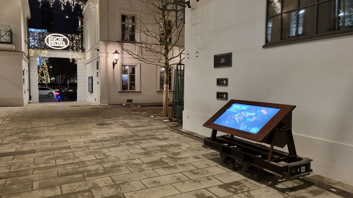 Najbardziej charakterystyczne z naszych rozwiązań są kioski umieszczone na autentycznych wózkach do transportu materiałów sypkich, które znajdują się zarówno wewnątrz, jak i na zewnątrz, co stanowi o ich wyjątkowości. Wykonanie z korodującego kortenu podkreśla industrialny charakter tych elementów, tak ważny dla Fabryki Norblina. Wyposażyliśmy je w 55-calowe monitory zamontowane pod kątem (dla poprawy ergonomii korzystania). Tu niezmiennie kluczowa była współpraca z konserwatorem zabytków – tak, by każdy element systemu mógł być zainstalowany w istniejących konstrukcjach. Dzięki temu kioski multimedialne Videofonika stały się częścią ekspozycji, a nie wyłącznie nowoczesnym dodatkiem.
