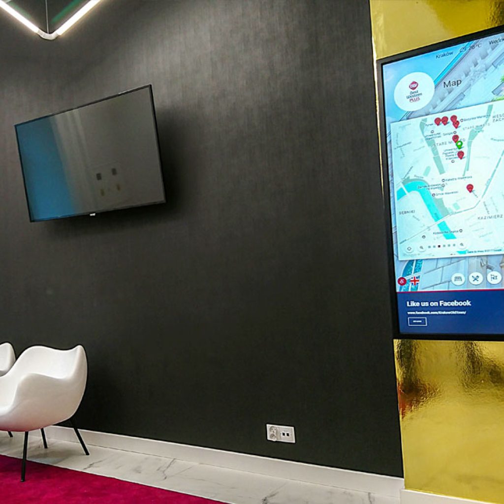 Oczywiście monitory, które instalujemy w części basenowej, powinny być odporne na temperaturę, wodę, chlor i wykazywać się szczelnością oraz odpowiednią wentylacją. Podobnie kioski hotelowe zlokalizowane przed budynkiem cechują się wytrzymałością na czynniki zewnętrzne i akty wandalizmu. Telewizja hotelowa również wymaga zastosowania odpowiednich urządzeń i dedykowanego oprogramowania. W Videofonice specjalizujemy się w technologiach dotykowych, a nasz dział projektowy dba o to, by ekrany obudowane były z najwyższą starannością i wyczuciem estetycznym, dopasowane do architektury hotelu. Wspólnie z naszymi partnerami technologicznymi możemy też przygotować ofertę w zakresie telewizji hotelowej.